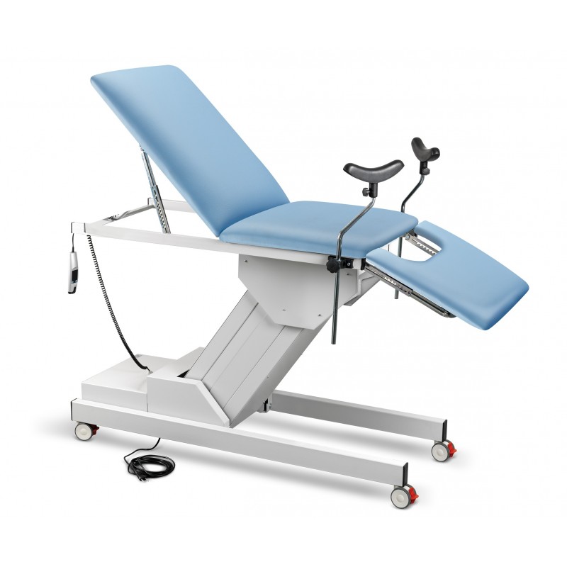 GYNAECOLOGICAL ELECTRICAL EXAMINATION COUCH WITH ADJUSTABLE HEIGHT 3 sections • Structure made of époxy painted steel oval tubes • Delivered dismantled • Adjustable backrest and anterior part by rack • Blue fireproof (Class 1 IM) padding...