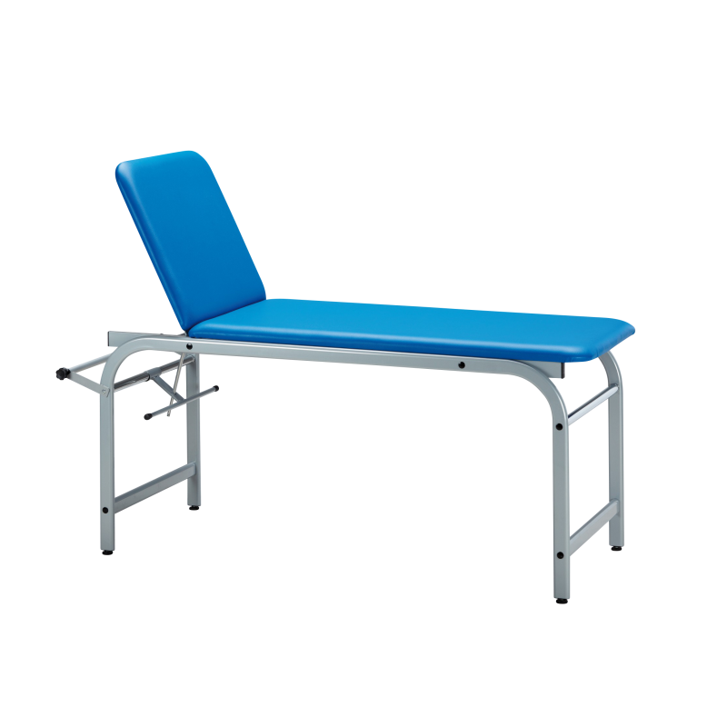 EXAMINATION COUCH 3 sections • Structure made of époxy painted steel oval tubes • Delivered dismantled • Adjustable backrest and anterior part by rack • Blue fireproof (Class 1 IM) padding made of high density polyurethane foam, and...