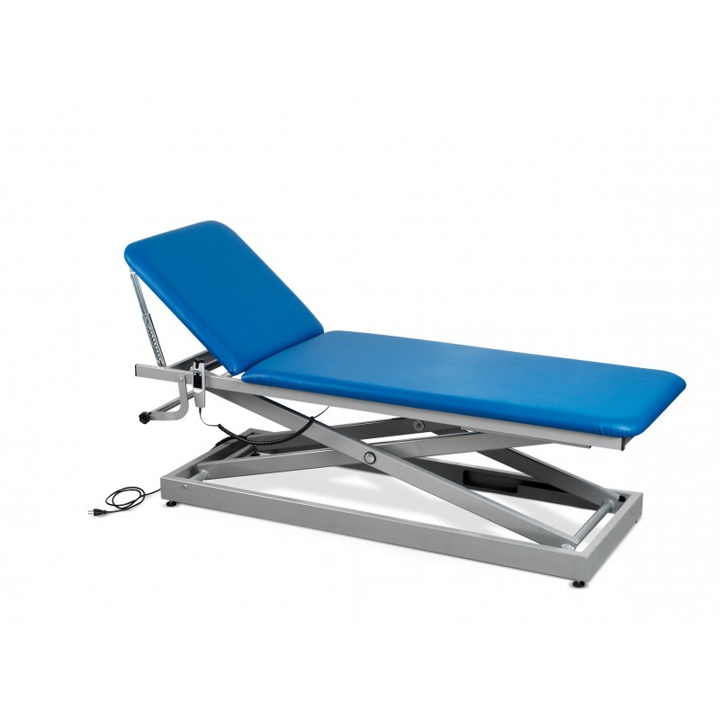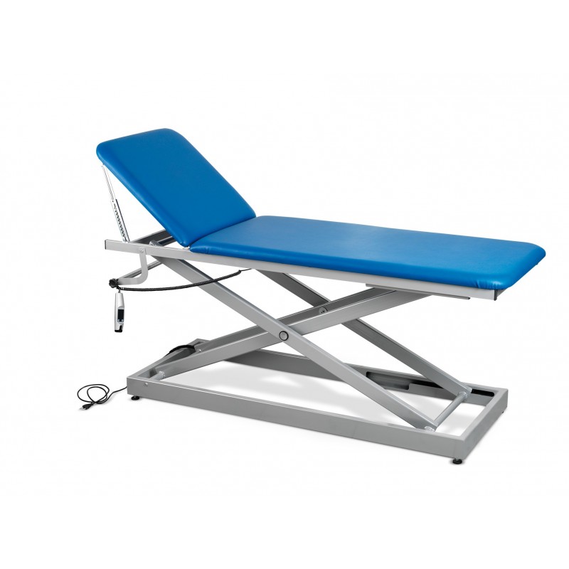 ELECTRICAL EXAMINATION COUCH WITH ADJUSTABLE HEIGHT 2 sections • Electrically adjustable height from 59cm (min) to 98cm (max) • Electrical system, actuator and remote control are waterproof • Backrest position adjustable by rack system :...