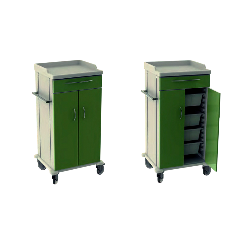 LINEN TROLLEY • Structure in melamine • Supporting base made of MDF covered with ABS • 4 wheels diam.125 mm, two of which with brake • 2 doors H.93 cm and L.30 cm • 1 drawer H.15 cm and L.60 cm • In agglomerate of poplar/fir covered...
