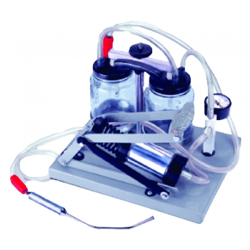 MANUAL SUCTION PUMP • Foot suction pump • Tray with handles for transport • Manometer: 0-760mm/Hg • 1 Suction cannula steel • Transparent tube 140cm • 1 Glas bottle 1L • Autoclavable • Lid with overflow systemAvailable with 2...