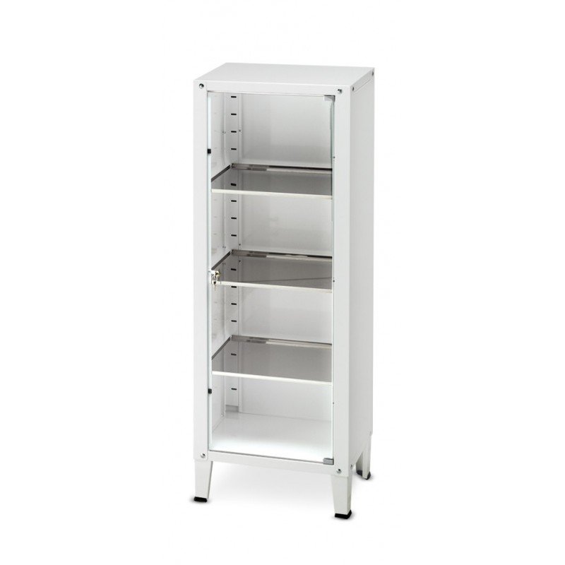MEDICINES CUPBOARD• Construction from enamelled sheet steel • Tempered glass doors • Lockable • 1 Spare key • 4 adjustable S.S. shelves • Dimensions: 80 x 37 x 193 cm