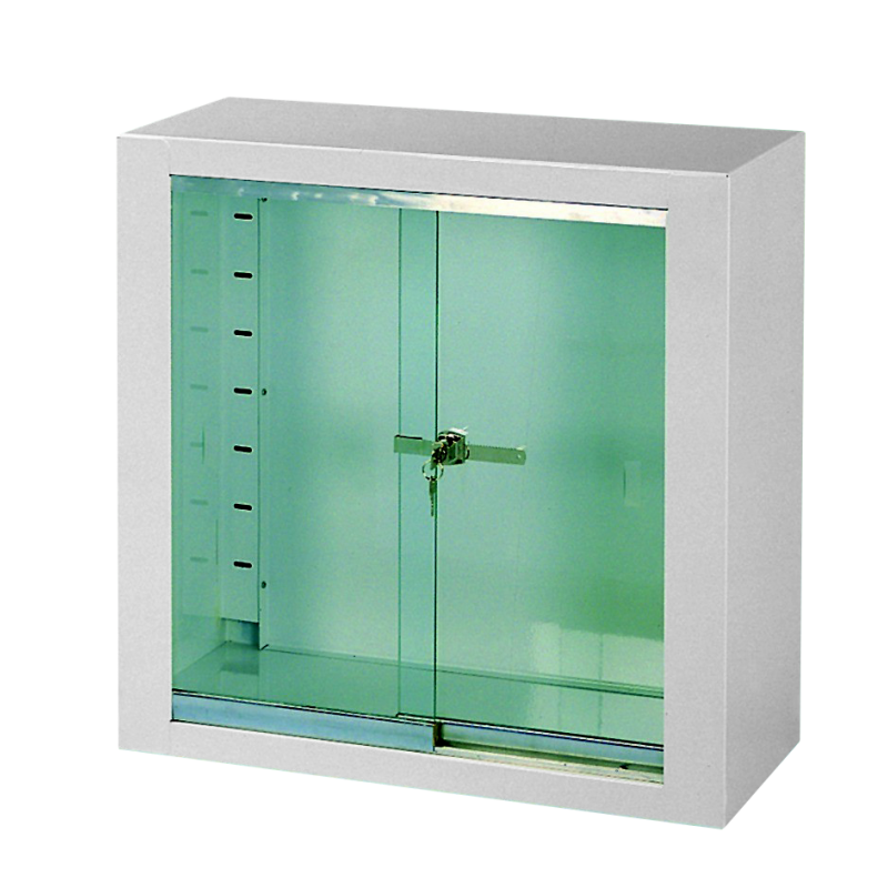 MEDICINES CUPBOARD• Construction from enamelled sheet steel • 2 Upper tempered glass doors • Lockable with key • 2 Upper removable S.S. shelves • 2 Lower steel sheet doors • Lockable with key • 1 Lower removable S.S. shelf •...