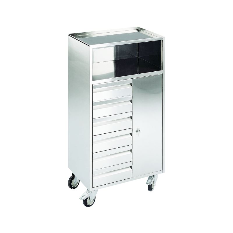 EMERGENCY TROLLEY • Dimensions: 56 x 64 x 104h cm • Structure, drawer faces and supporting base in melamine • Working surface made of washable, shockproof polystyrene • 4 drawers: 3 x h14.5cm & 1 x 31.5cm • Drawers made of plastic on...