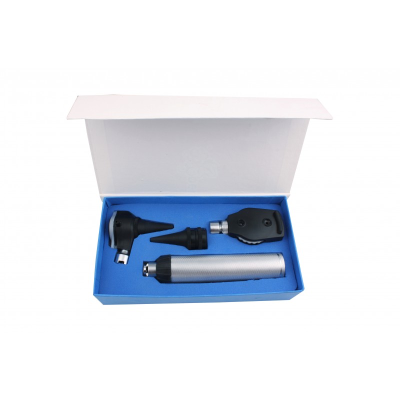 LED ENT KIT Supplied in a case including: • 2,7 V Led illumination • Chrome plated battery handle for 2 C batteries (not included) • Otoscope head Fastlock fitting • Chrome plated otoscope head • Protective movable lens 3x on plastic...